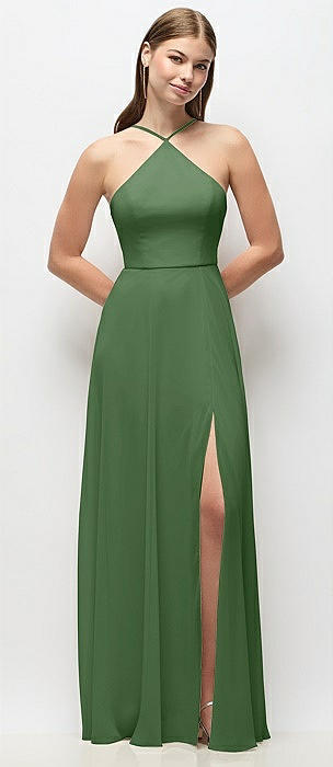 High-Neck Halter Chiffon Maxi Dress with Adjustable Spaghetti Straps in vineyard green