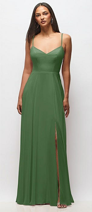 Spaghetti Strap Draped Skirt Gown with Front Slit in vineyard green