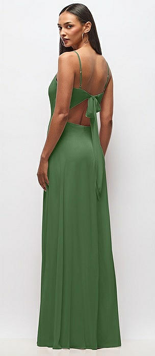 Bow-Shoulder V-Back Chiffon Gown with Front Slit in vineyard green