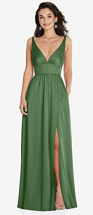 Plunge Neckline Bow Shoulder Empire Waist Chiffon Maxi Dress in vineyard green