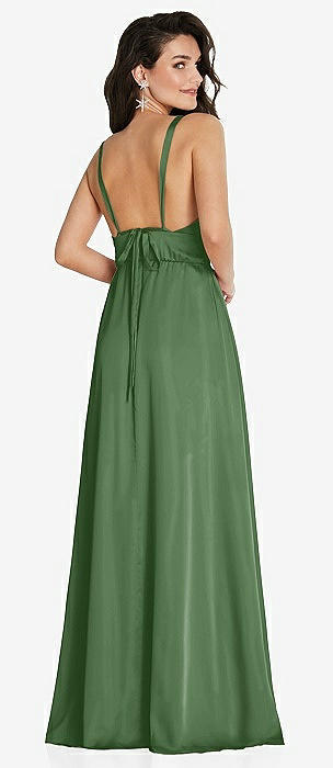 Bow-Shoulder V-Back Chiffon Gown with Front Slit in vineyard green