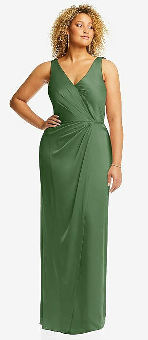 Faux Wrap Whisper Satin Maxi Dress with Draped Tulip Skirt in vineyard green