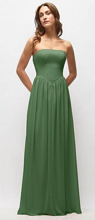 Strapless Basque Drop Waist Chiffon Maxi Dress with Shirred Skirt in vineyard green
