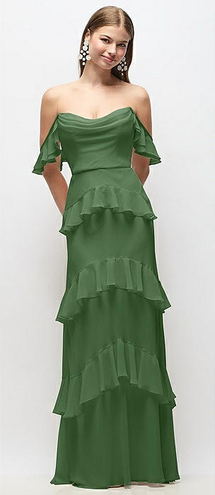 Off-the-Shoulder Cowl Chiffon Tiered Ruffle Maxi Dress with Convertible Ruffle Straps in vineyard green