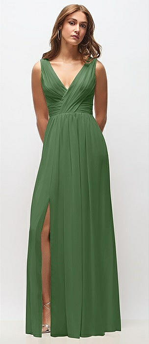 Sleeveless Draped Chiffon Maxi Dress with Front Slit in vineyard green