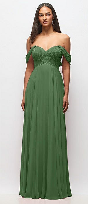 Off-the-Shoulder Draped Chiffon Maxi Dress in vineyard green