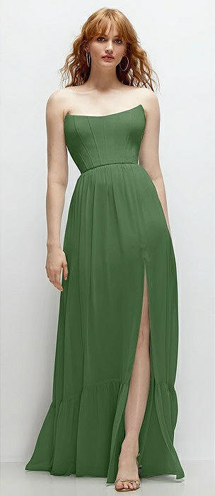Strapless Cat-Eye Corset Maxi Dress with Ruffle Hem A-Line Skirt in vineyard green