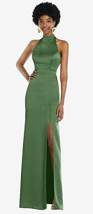 High Neck Backless Maxi Dress with Slim Belt in vineyard green