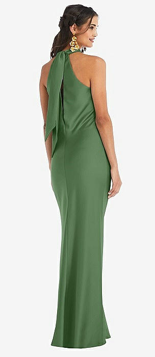 Draped Twist Halter Tie-Back Trumpet Gown in vineyard green