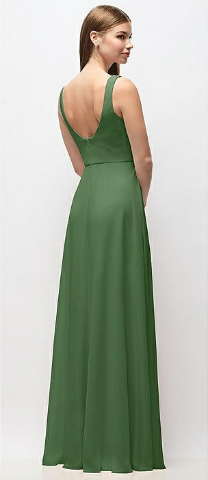 Bow-Shoulder V-Back Chiffon Gown with Front Slit in vineyard green