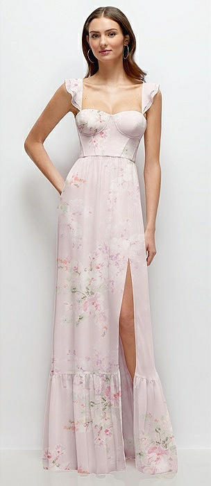 Ruffle Strap Chiffon Bustier Maxi Dress with Ruffle Hem A-Line Skirt in watercolor print