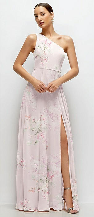 One-Shoulder Chiffon Maxi Dress with Shirred Front Slit in watercolor print
