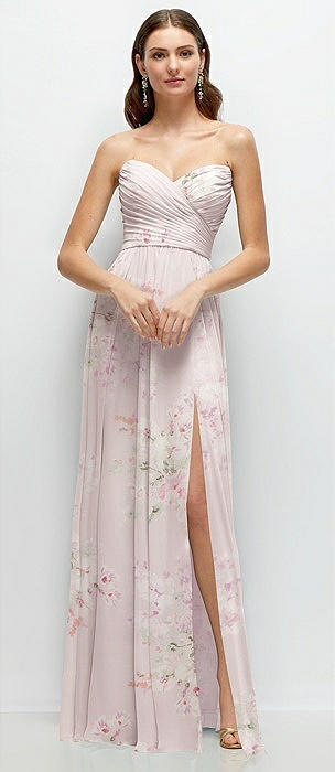 Strapless Pleated Surplice Chiffon Maxi Dress with A-Line Skirt in watercolor print