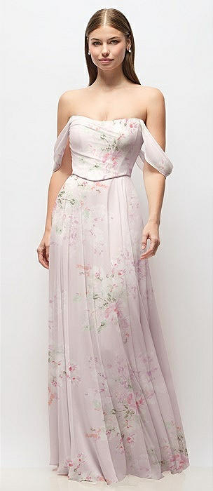 Off-the-Shoulder Basque Corset Floral Chiffon Maxi Dress in watercolor print