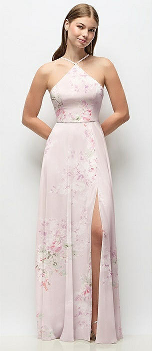 High-Neck Halter Floral Chiffon Maxi Dress with Adjustable Spaghetti Straps in watercolor print
