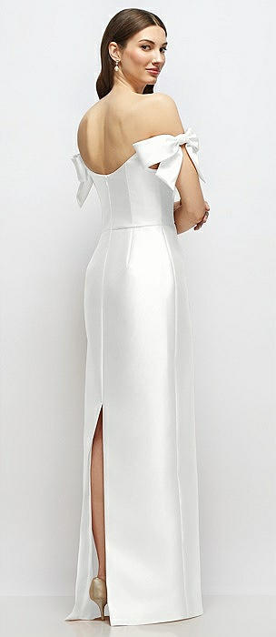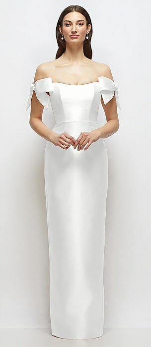 Basque-Neck Satin Column Maxi Dress with Off-the-Shoulder Bows in white