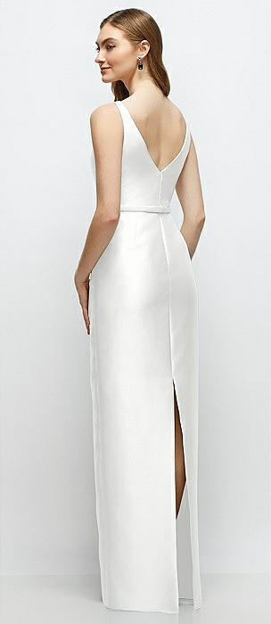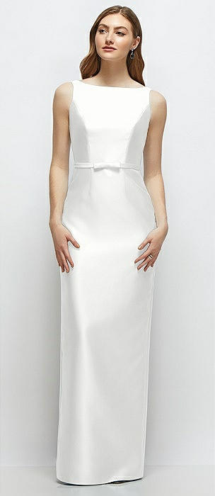Bateau Neck Satin Column Dress with Bow-Trimmed Skinny Belt in white