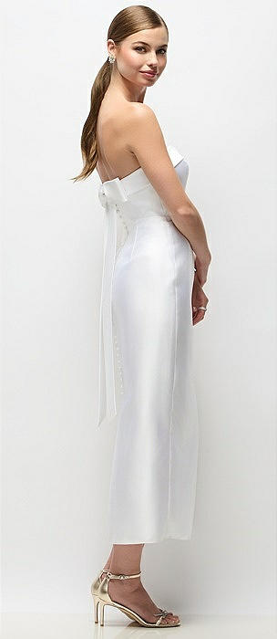 Strapless Cuff Satin Midi Dress with Column Skirt & Back Bow in white