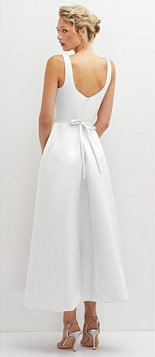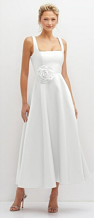 Square Neck Satin Midi Dress with Full Skirt & Flower Sash in white
