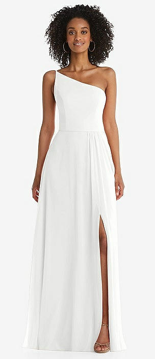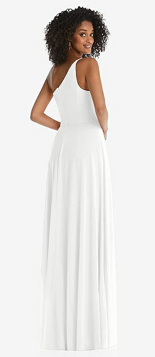 One-Shoulder Chiffon Maxi Dress with Shirred Front Slit in white