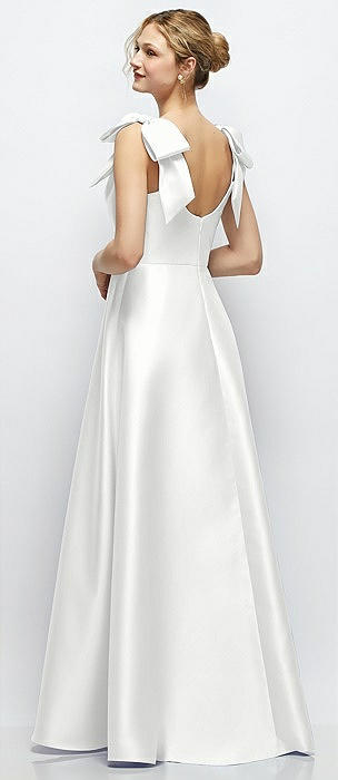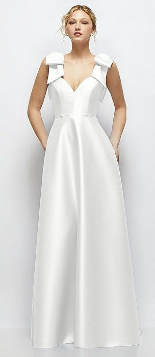 Deep V-Neck Satin Ball Gown with Shoulder Bows in white