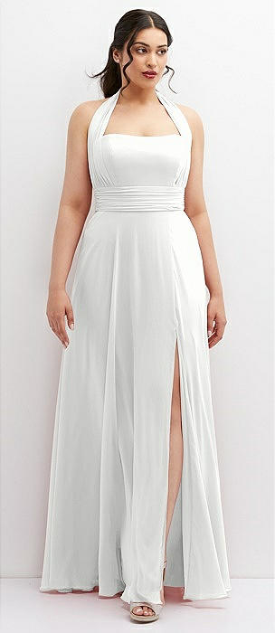 Shirred Skirt Jewel Neck Halter Dress with Front Slit in white