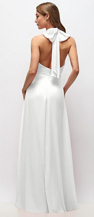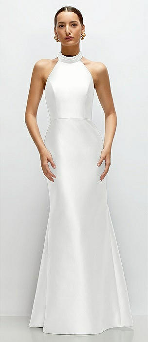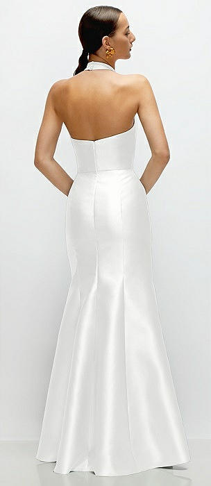 High-Neck Halter Open-Back Satin Trumpet Dress in white