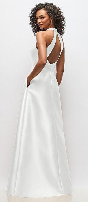 Jewel Neck Halter Full A-Line Satin Maxi Dress in white