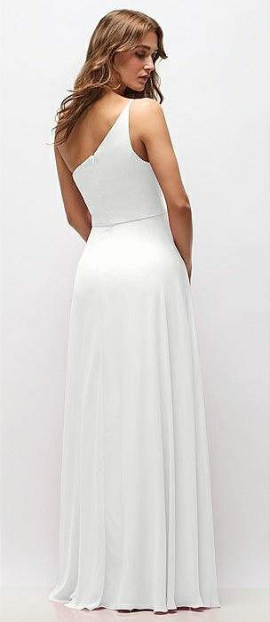 One-Shoulder Chiffon Maxi Dress with Shirred Front Slit in white