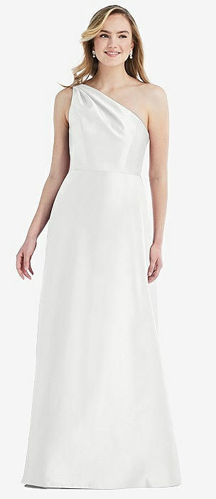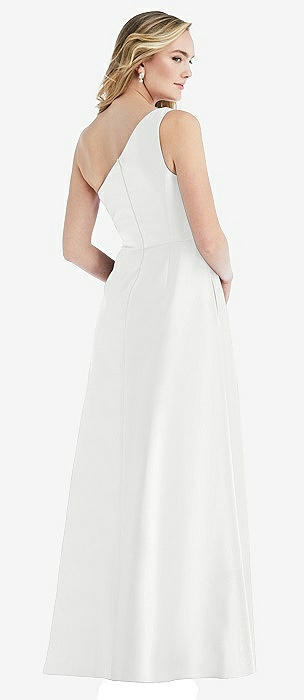 One-Shoulder Satin Gown with Draped Front Slit and Pockets in white