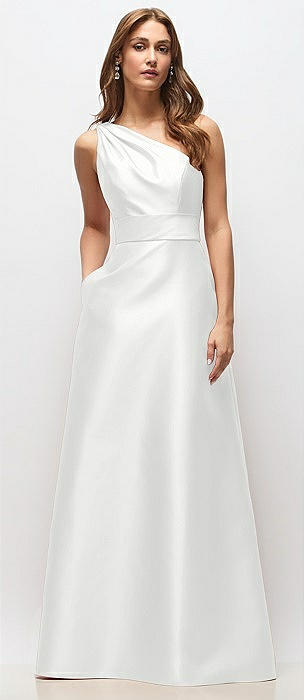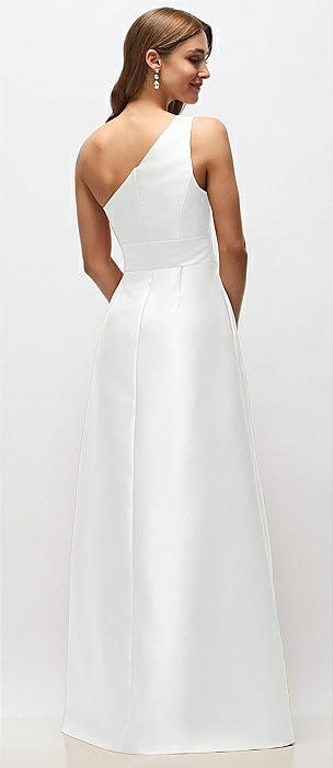 Draped One-Shoulder Satin Maxi Dress with Pockets in white