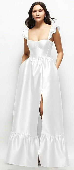 Satin Corset Maxi Dress with Ruffle Straps & Skirt in white