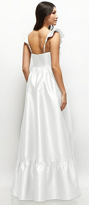 Bow-Shoulder Satin Maxi Dress with Asymmetrical Tiered Skirt in white