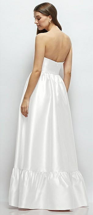 Strapless Satin Maxi Dress with Cascade Ruffle Peplum Detail in white