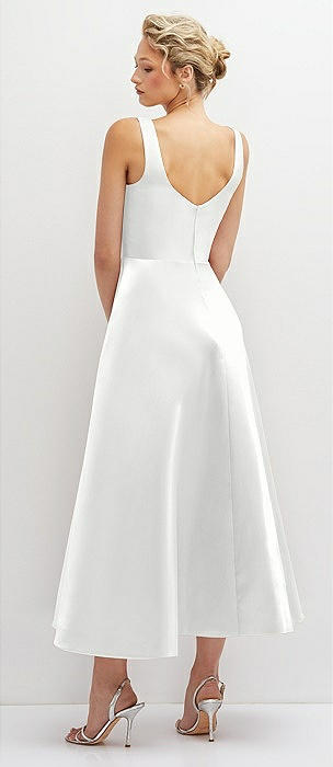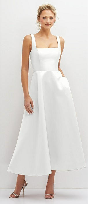Square Neck Satin Midi Dress with Full Skirt & Pockets in white