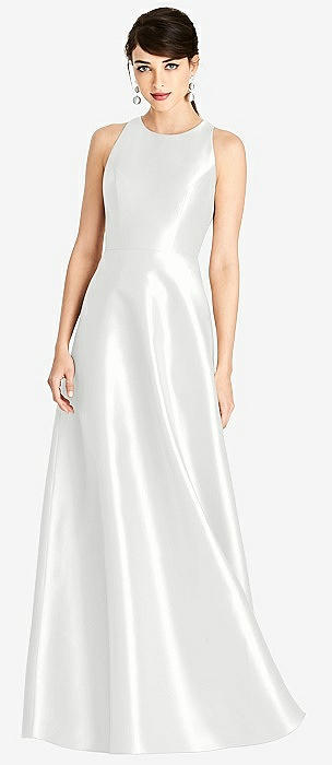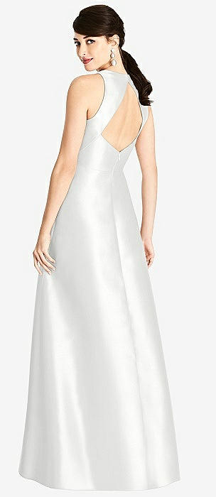 Off-the-Shoulder Bow-Back Satin Trumpet Gown in white
