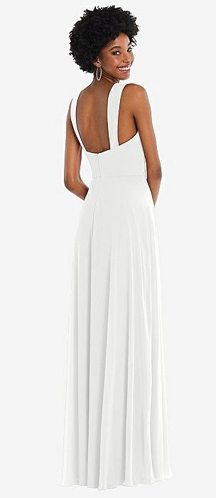 Bow-Shoulder V-Back Chiffon Gown with Front Slit in white