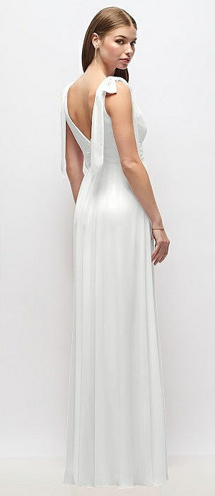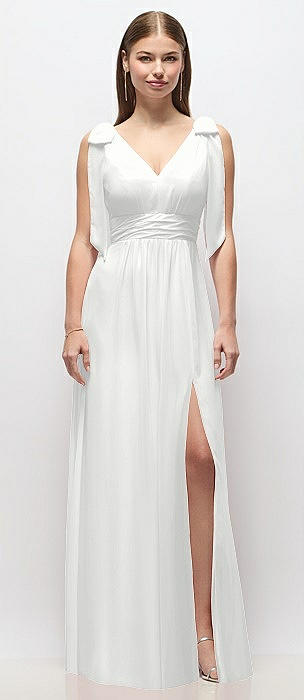 Plunge Neckline Bow Shoulder Empire Waist Chiffon Maxi Dress in white
