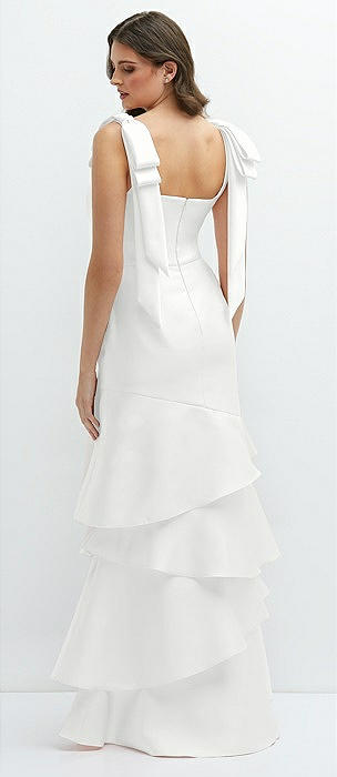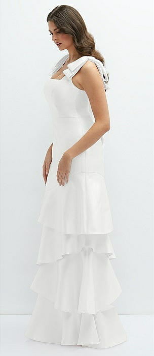 Bow-Shoulder Satin Maxi Dress with Asymmetrical Tiered Skirt in white