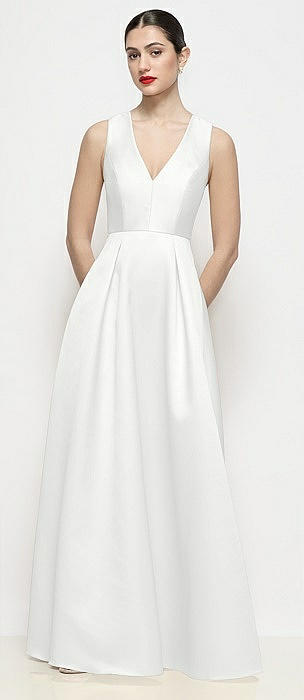 Deep V-Neck Satin Ball Gown with Shoulder Bows in white