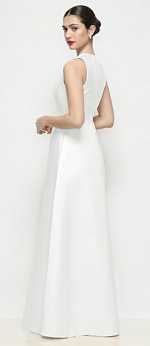 Deep V-back Satin Trumpet Dress with Cascading Bow at One Shoulder in white