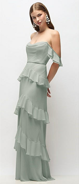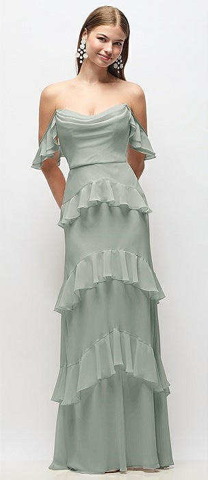 Off-the-Shoulder Cowl Chiffon Tiered Ruffle Maxi Dress with Convertible Ruffle Straps in willow green