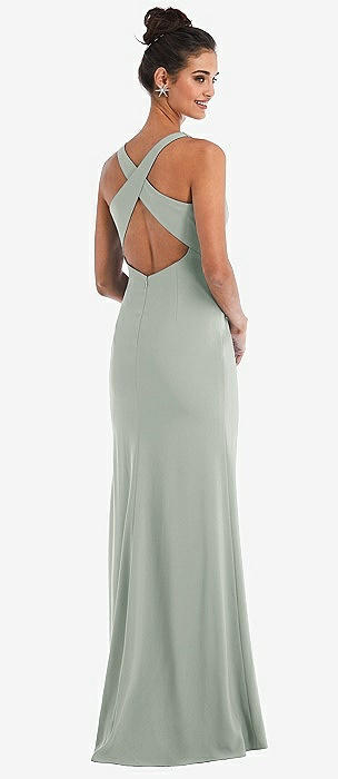 Off-the-Shoulder Criss Cross Back Trumpet Gown in willow green