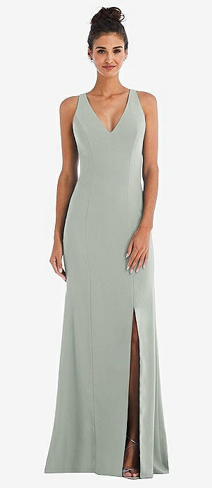 V-Neck Convertible Strap Bias Slip Dress with Front Slit in willow green
