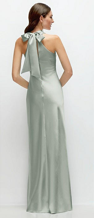 Pleated Halter Bias Satin Maxi Dress with Self-Tie Bow Back in willow green