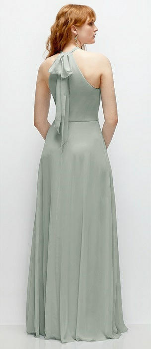 Shirred Halter Chiffon Maxi Dress with Back Sash-Tie Closure in willow green