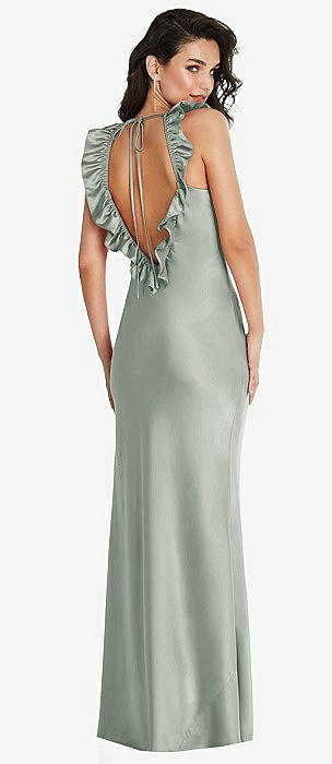 Ruffle Trimmed Open-Back Maxi Slip Dress in willow green