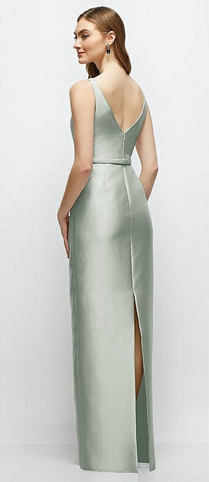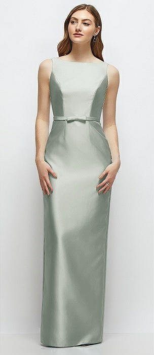 Bateau Neck Satin Column Dress with Bow-Trimmed Skinny Belt in willow green