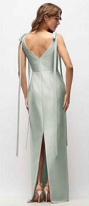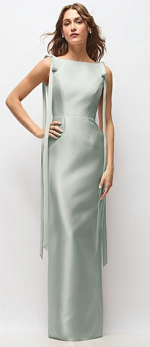 Bateau Neck Satin Column Maxi Dress with Exaggerated Tail Bow Straps in willow green