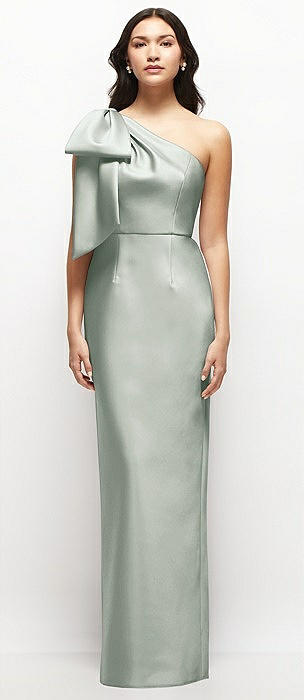 Oversized Bow One-Shoulder Satin Column Maxi Dress in willow green